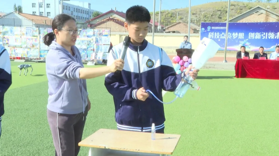 在“教师科学展”环节上,物理老师带来自制“等离子炮”,发出震撼响声与耀眼火光,引得全场惊呼,化学老师们则演示了经典的“法老之蛇”实验,让学生直观感受化学反应的奇妙。“学生作品展”同样精彩,同学们依次上台,分别演示“静电现象的产生与消除”“连通器应用原理”。随后,旗科协工作人员操控的机器狗与小型机器人登场,灵活的动作、趣味的互动,让现场气氛持续升温。