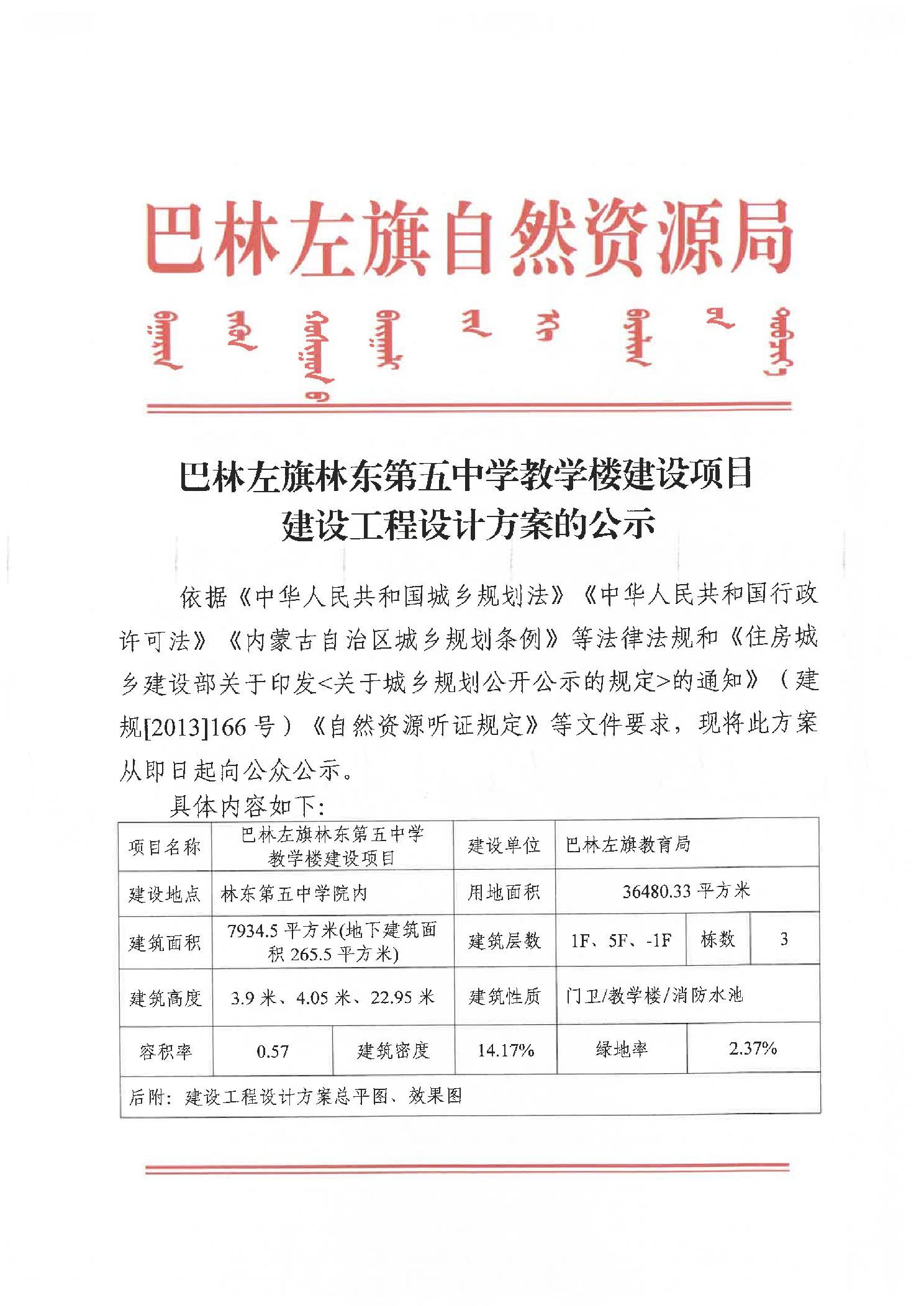 巴林左旗林东第五中学教学楼建设项目建设工程设计方案的公示