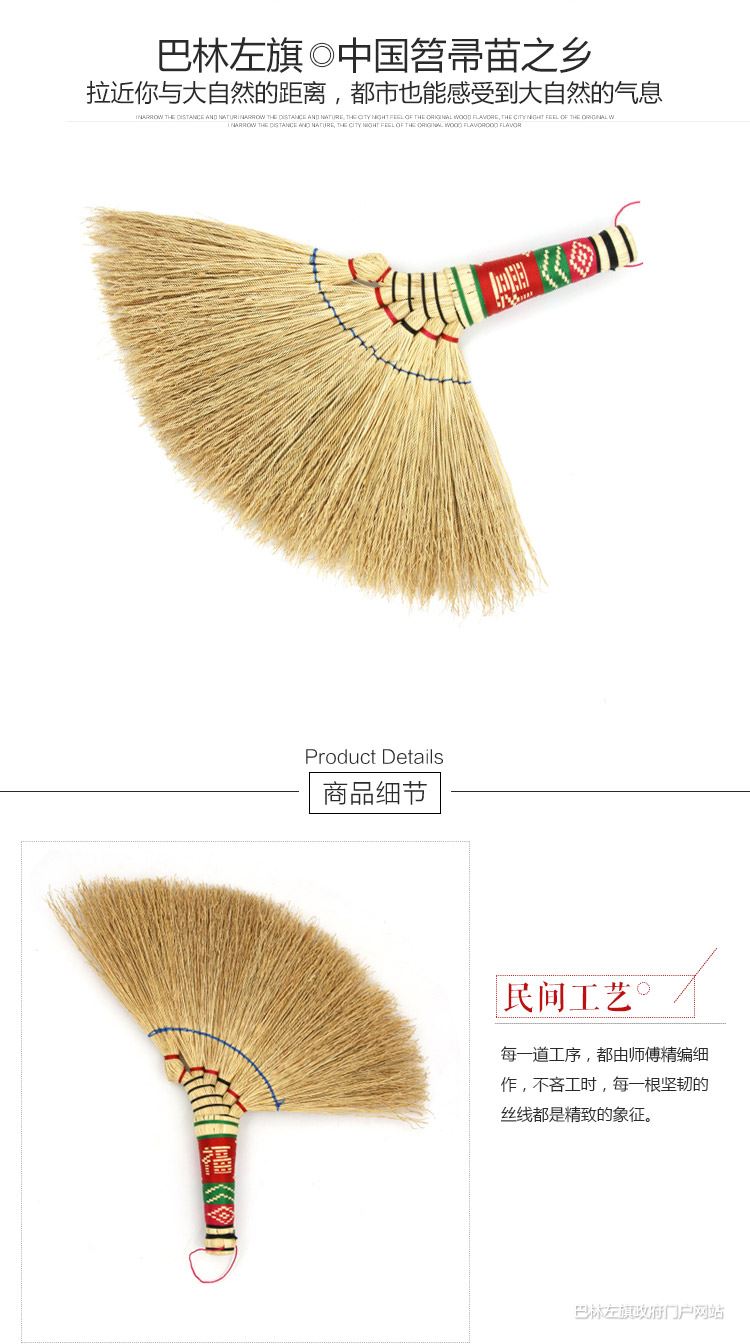 笤帚制品可作为新婚嫁娶、小儿满月、开业、乔迁或生日礼品进行赠送,具有镇宅避邪,如意旺财、开启智慧之寓意。以其绿色环保、无污染、无公害,倍受农村、城镇、工厂、学校和企事业单位等消费者的青睐,有着巨大的市场潜力,公司本着“诚招天下客,誉从信中来”的企业理念,竭诚欢迎国内外同行来我公司指导工作,洽谈业务,我们将以最大的努力,为您提供最满意的服务。