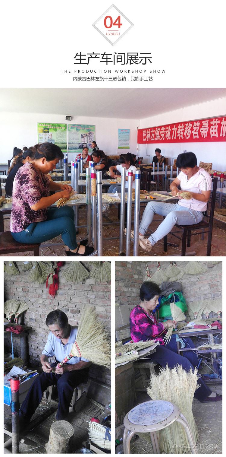 公司主要从事各类笤帚苗、加工制造普通笤帚、精品笤帚、竹木柄笤帚,同时加工出口韩国、日本、台湾等地笤帚,